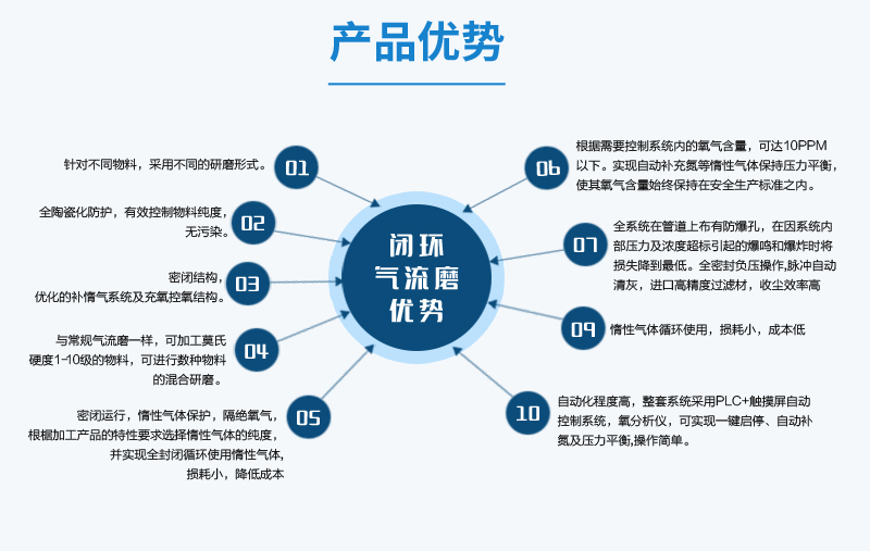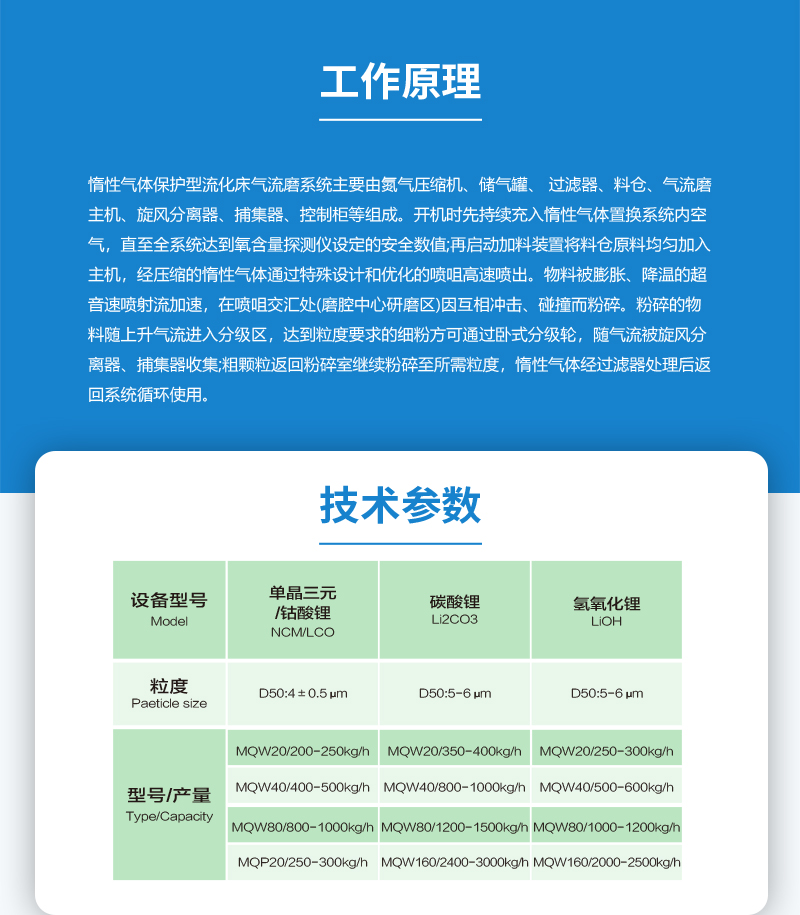 碳酸锂气流粉碎机是一款具有多项优势的机械设备,其中包括无污染粉碎产品、细度可调、粒度分布集中、颗粒形貌规则、处理能力大、自动化高等。碳酸锂气流粉碎机采用独特的陶瓷内衬,保证了产品安全无污染,对粉碎物料的细度有很好的控制,可根据客户需求调整粉碎细度;粒度分布集中,颗粒形貌规则,粉碎质量高;处理能力大,效率高;操作简单,自动化程度高;运行稳定,噪音低,适用于医药级碳酸锂和电池级碳酸锂的生产,是您理想的碳酸锂气流粉碎机选择。